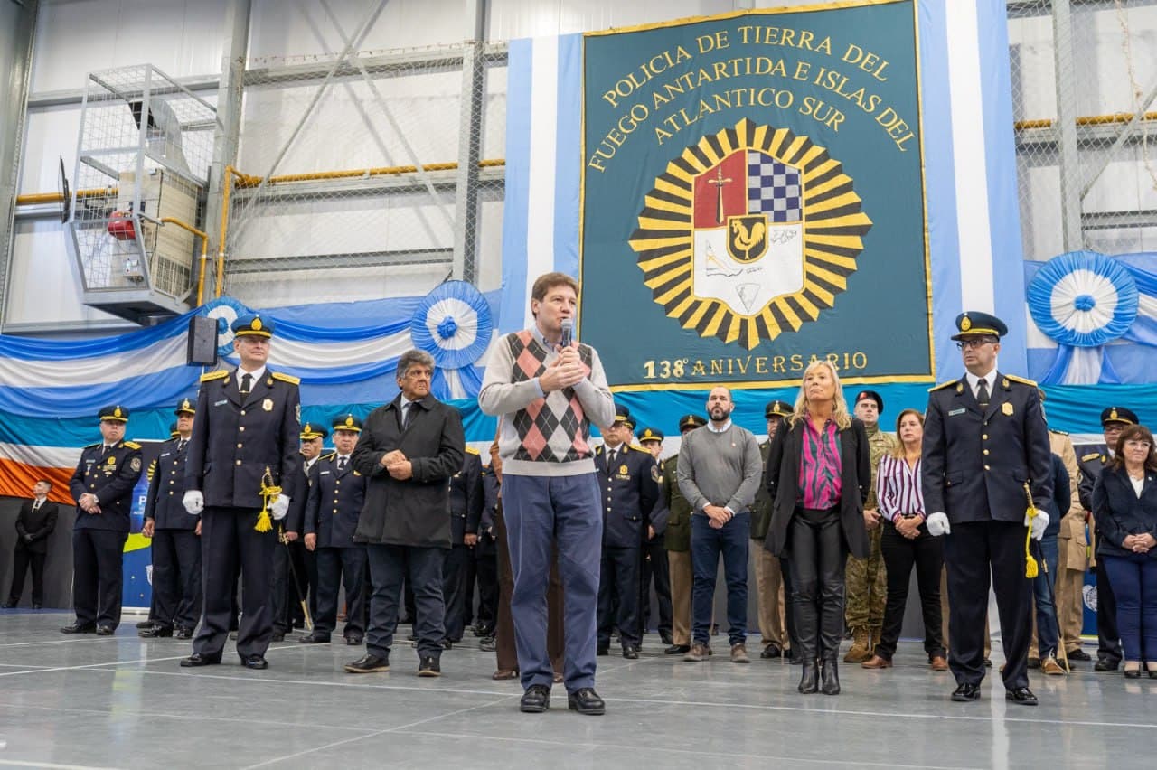 En las instalaciones del gimnasio de la Escuela Superior de Policía se llevó adelante el acto por el 138 Aniversario de la Policía Provincial, el mismo contó con la presencia del gobernador Gustavo Melella.
