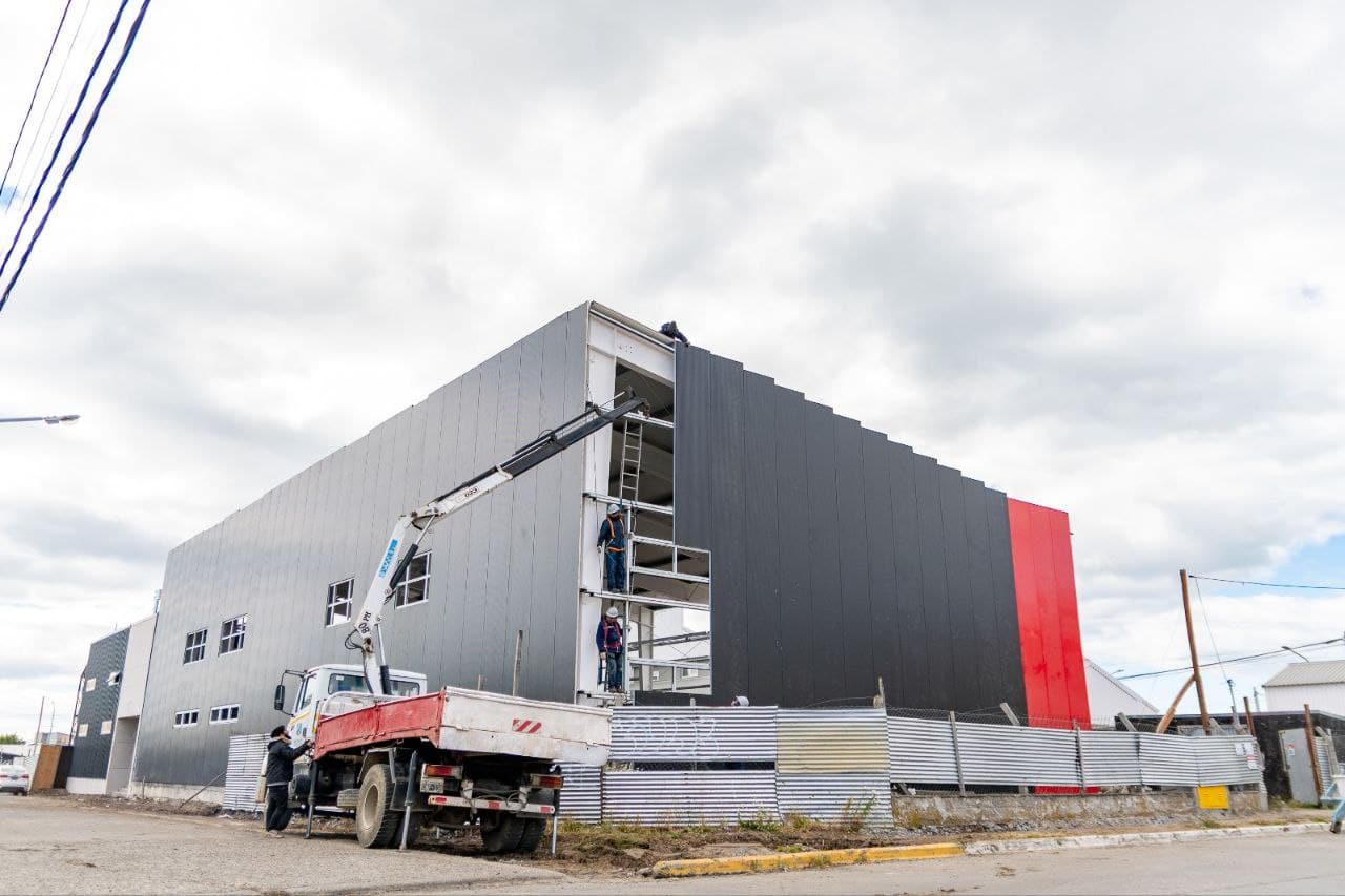 Actualmente, los trabajos se concentran en el cerramiento del gimnasio mediante la colocación de paneles prearmados con aislamiento térmico. Esta etapa resulta fundamental para definir la envolvente del edificio, y también para resguardar la estructura de las condiciones climáticas, permitiendo el avance ininterrumpido de las tareas interiores.