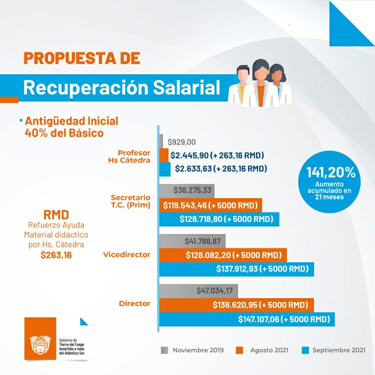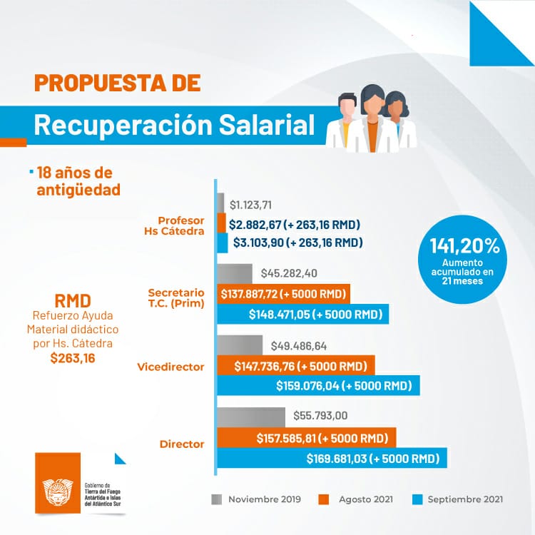 Este es el detalle de la propuesta salarial que entregó la Ministra de Educación, Analía Cubino al representante del sector docente, Horacio Catena, correspondiente al segundo semestre del año. Se elaboró y presentó en el marco del Plan de Recuperación del Salario, a fin de mejorar las condiciones laborales de las y los docentes.