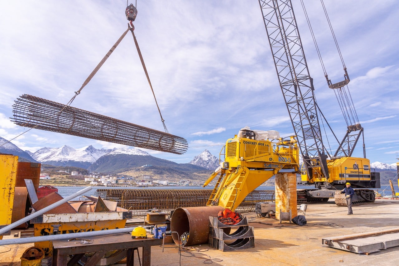Cabe recordar que los pilotes son un total de 32, poseen 1.5 metros de diámetro y unos 40 de profundidad, que conformarán los siete pórticos donde quedará emplazada la ampliación del muelle comercial del Puerto de Ushuaia.