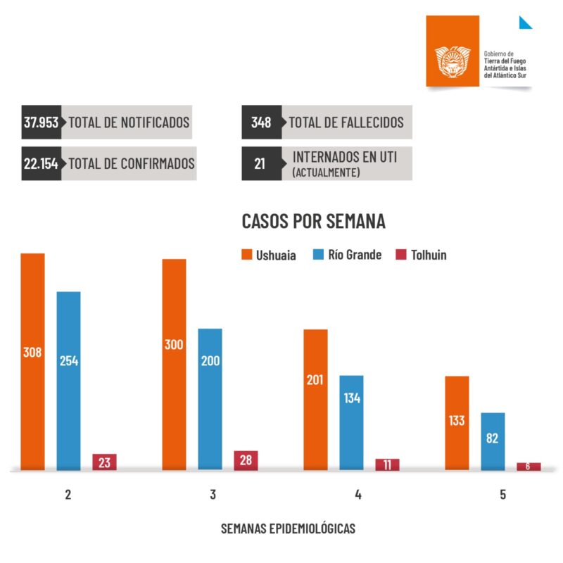 “Respecto del modo de transmisión, continúa siendo preponderante la transmisión comunitaria con 402 casos en Río Grande, 582 en Ushuaia y 34 en Tolhuin y los contagios por contacto estrecho que alcanzan 174 casos en Río Grande, 142 en Ushuaia y 45 en Tolhuin en el período de las últimas 4 semanas”, comunicó.