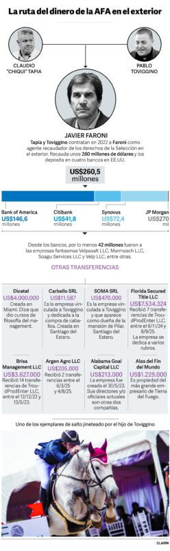 Las cuentas de Javier Faroni en bancos de Estados Unidos siguen dando sorpresas. Por un lado, a la empresa argentina Carbello SRL, dueña de los caballos que montan los hijos de Pablo Toviggino, el tesorero de la AFA, TourProdEnter le envió 11.587 dólares, un monto menor que el que mandó a SOMA SRL, la propietaria de la mansión de Pilar valuada en 17 millones de dólares, pero significativo. Otras empresas que recibieron plata son M&H Horses Services de Francia, dedicada al transporte de caballos, y Equestrian, que compra y vende caballos de salto.