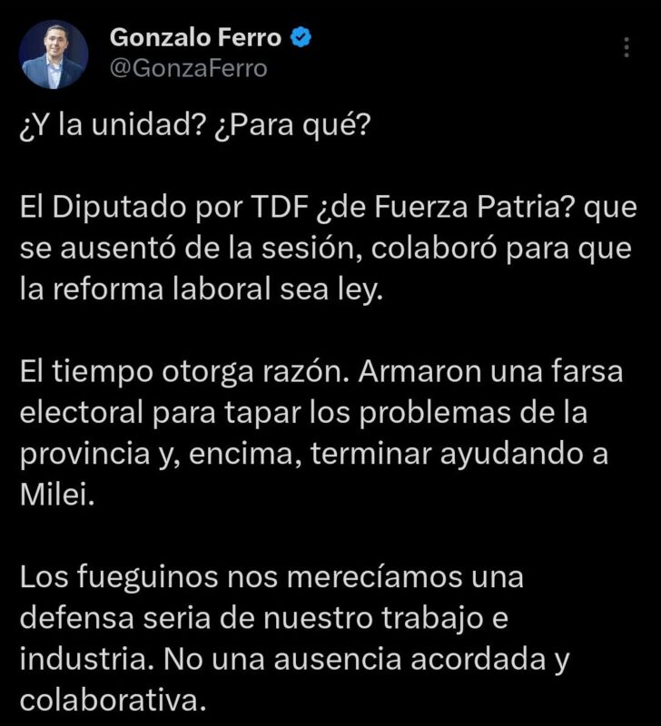 El secretario municipal Gonzalo Ferro posteó desde sus redes sociales (ver abajo); “El Diputado por TDF ¿de Fuerza Patria? que se ausentó de la sesión, colaboró para que la reforma laboral sea ley”. “El tiempo otorga razón. Armaron una farsa electoral para tapar los problemas de la provincia y, encima, terminar ayudando a Milei”. “Los fueguinos nos merecíamos una defensa seria de nuestro trabajo e industria. No una ausencia acordada y colaborativa”, acusó en relación a la ausencia de Tita.