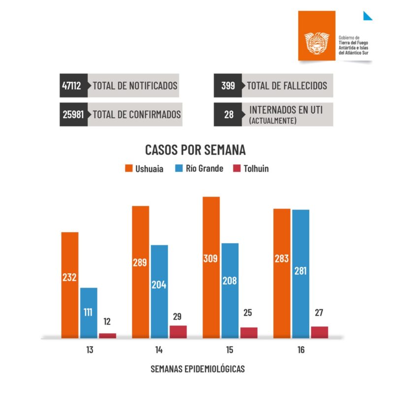 En la última semana se detectaron 283 casos nuevos en Ushuaia, 281 en Río Grande y 27 en Tolhuin. Actualmente hay 28 pacientes internados en UTI en toda la Provincia.
