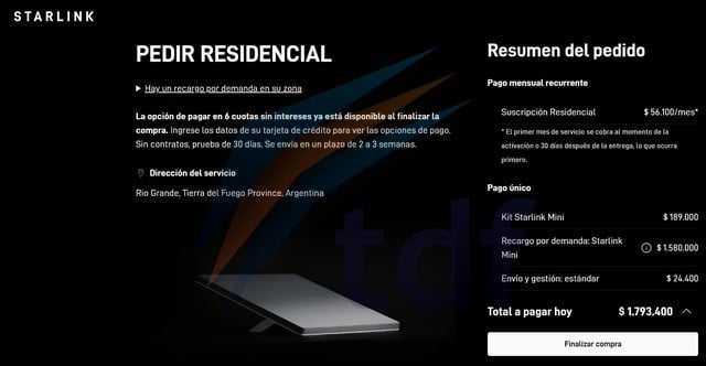 Al valor del del Kit Starlink Mini por $ 189.000 y sumando gastos de envío, aparece un costoso “recargo por demanda” que asciende a $1.580.000.