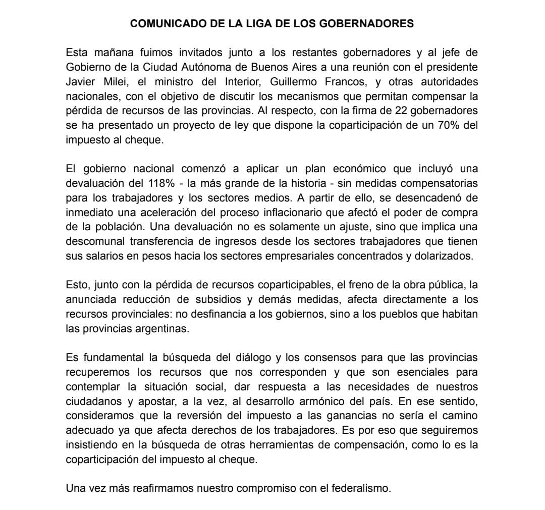 En ese documento recordaron que “con la firma de 22 gobernadores se ha presentado un proyecto de ley que dispone la coparticipación de un 70% del impuesto al cheque”.