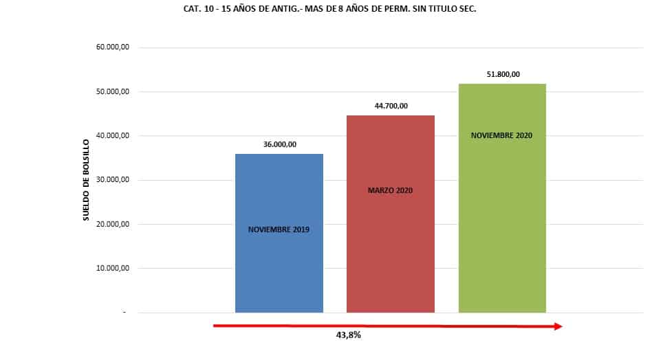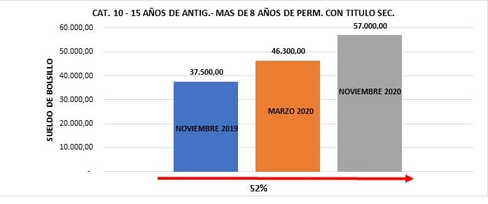 En el caso de un trabajador categoría 10 con título secundario el incremento interanual noviembre 2019 – noviembre 2020 alcanza el 55% por ciento pasando de cobrar $34.000 pesos en 2019 a $52.800 en noviembre de 2020.