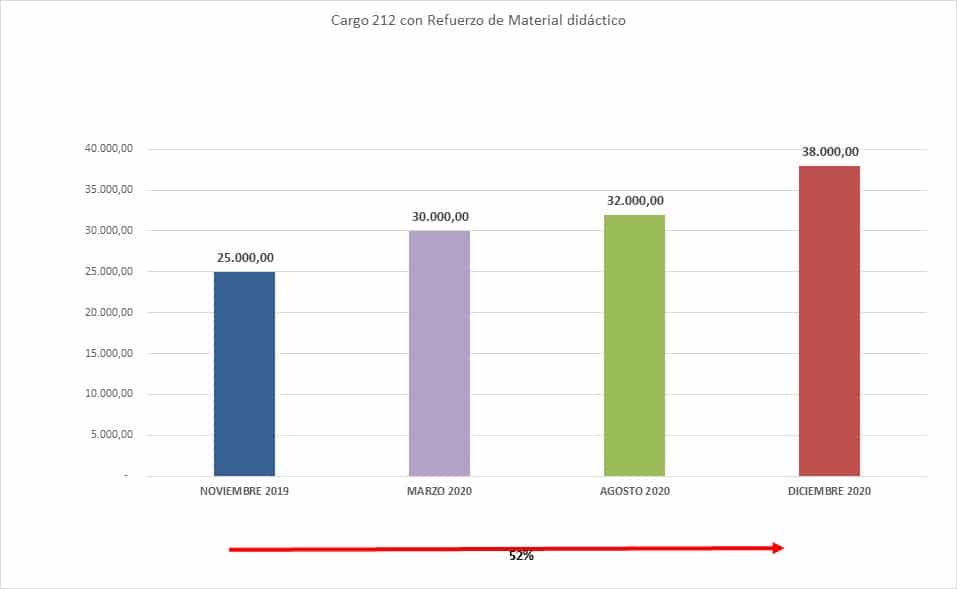 En el caso del sector docente, un maestro de grado con un solo cargo recibió un incremento salarial interanual entre noviembre de 2019 y diciembre de 2020 del 52 por ciento, ya que el mismo percibía un salario de $25.000 pesos en 2019 y con este último incremento cobrará $38000 mil pesos de bolsillo con la inclusión del material didáctico.