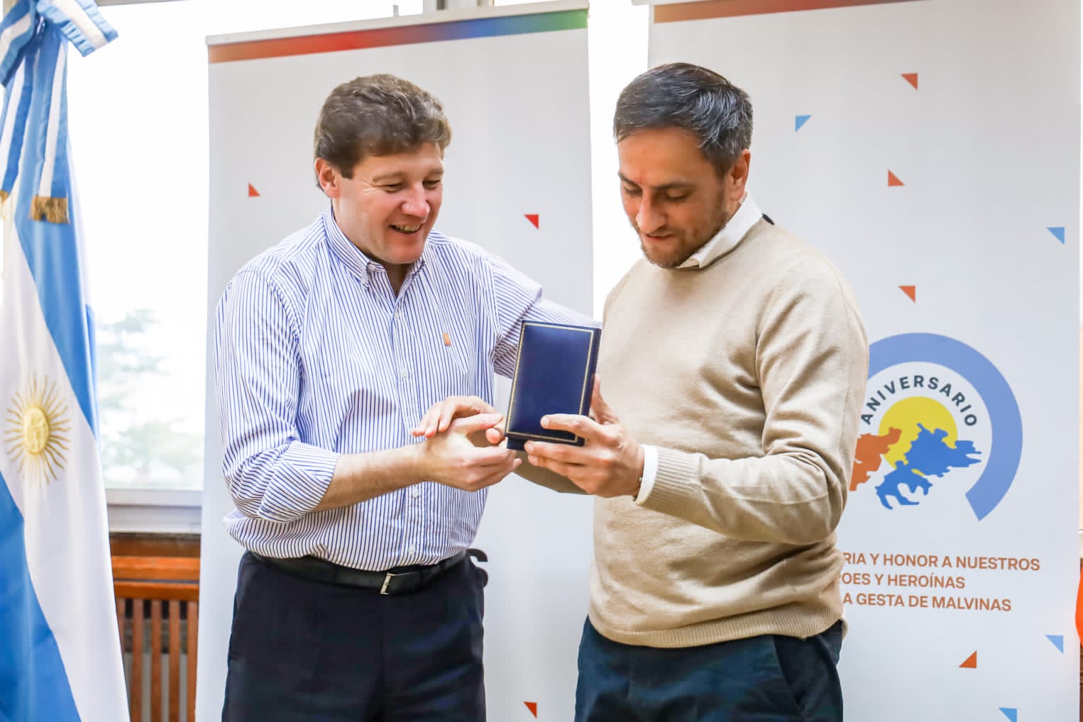 Durante el encuentro, el Mandatario Provincial hizo entrega de presentes protocolares, entre ellos, la Medalla alusiva a los 40 años de la Gesta de Malvinas.