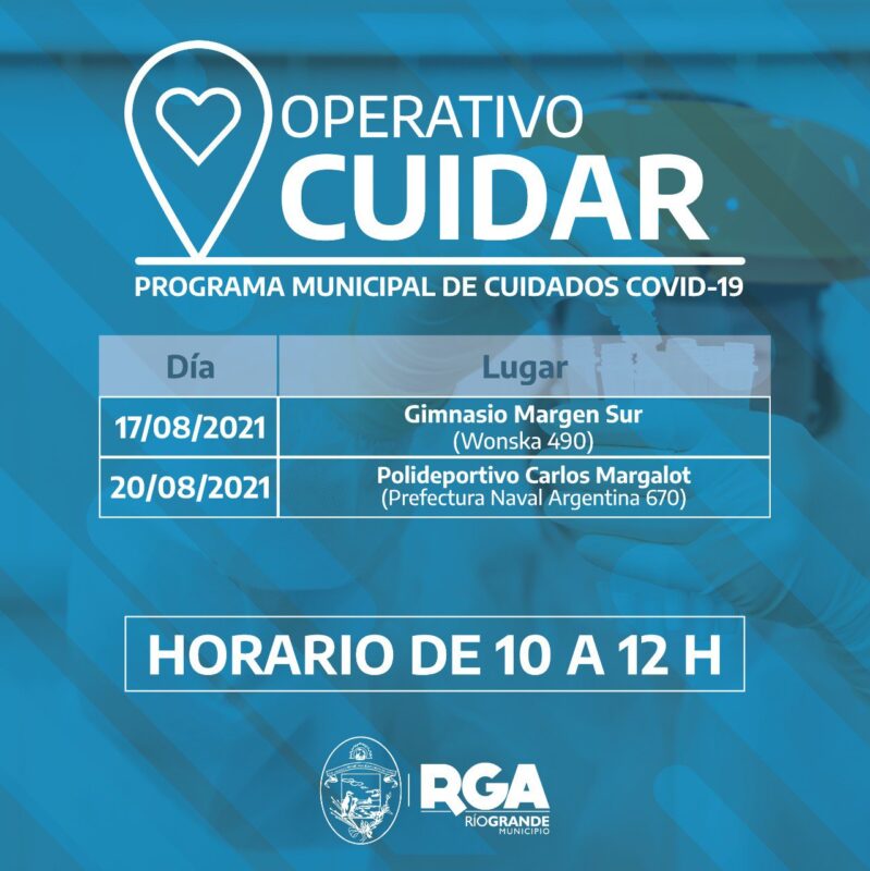 El Municipio de Río Grande, a través de las Secretarías de Salud y de Gestión Ciudadana, informa a los vecinos y vecinas los días, lugares y horarios en los cuales se desarrollarán los operativos de testeos voluntarios de Covid-19 en la semana del 16 al 20 de agosto.
