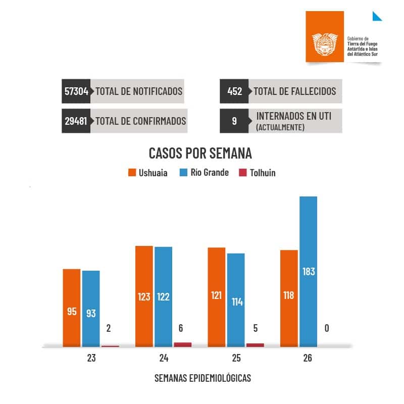 En la última semana se detectaron 118 casos nuevos en Ushuaia, 183 en Río Grande y 0 en Tolhuin. Actualmente hay 9 pacientes internados en UTI en toda la Provincia.