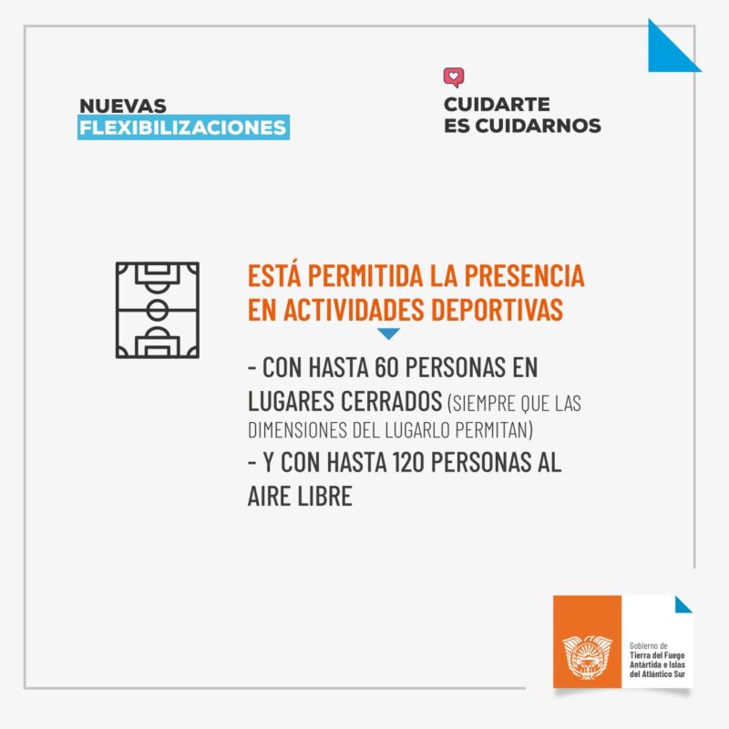 De esta manera, se autorizó en toda la provincia la presencia en actividades deportivas con hasta 60 personas en lugares cerrados, siempre que las dimensiones del lugar permitan dicho aforo respetando la distancia social obligatoria y 120 personas al aire libre, cumpliendo distanciamiento entre personas de 1.5 mts. y uso obligatorio de barbijo o tapa bocas.