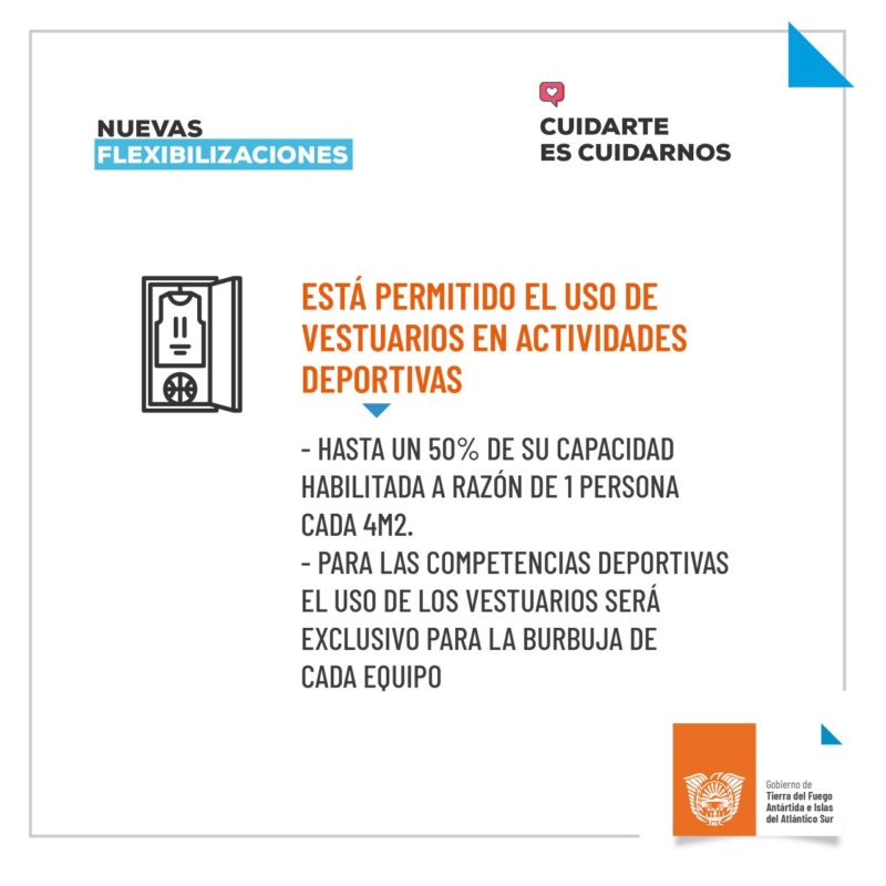 También se autoriza el uso de vestuarios en actividades deportivas hasta un 50% de su capacidad habilitada a razón de 1 persona cada 4m2. Para las competencias deportivas el uso de los vestuarios será exclusivo para la burbuja de cada equipo.