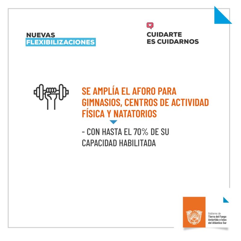 Además se amplía en toda la provincia el aforo para gimnasios, centros de actividad física y natatorios, hasta el 70% de su capacidad habilitada.