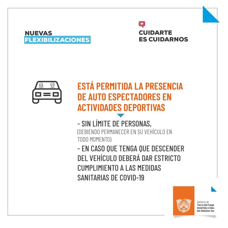 Se autorizó también la presencia de auto espectadores en actividades deportivas sin límite de personas, debiendo permanecer en su vehículo en todo momento y para el caso que la persona descienda del mismo deberá dar estricto cumplimiento a las medidas sanitarias en materia Covid-19.