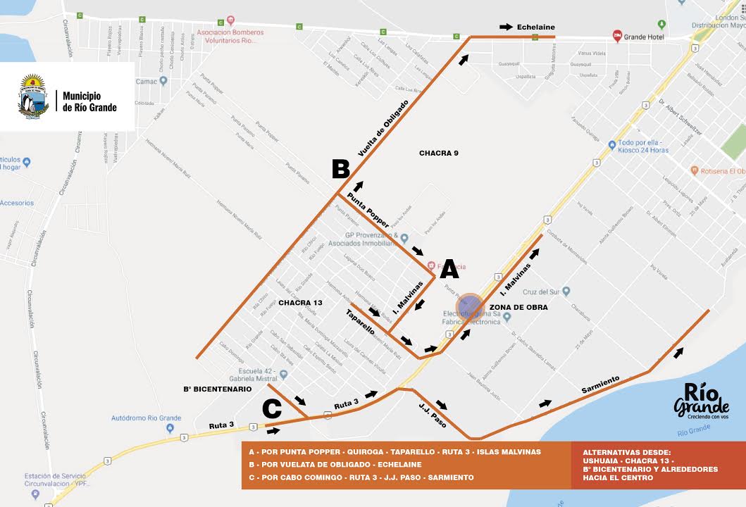 A.- Por Punta Popper, por Quiroga, Taparrello, Ruta 3 y circulando por islas Malvinas