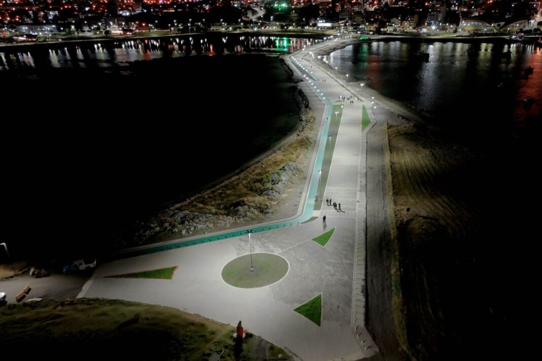 En el marco de los trabajos finales de la obra de remodelación y puesta en valor de la Pasarela Luis Pedro Fique, se realizó la primera prueba del sistema de alumbrado del emblemático espacio de Ushuaia.