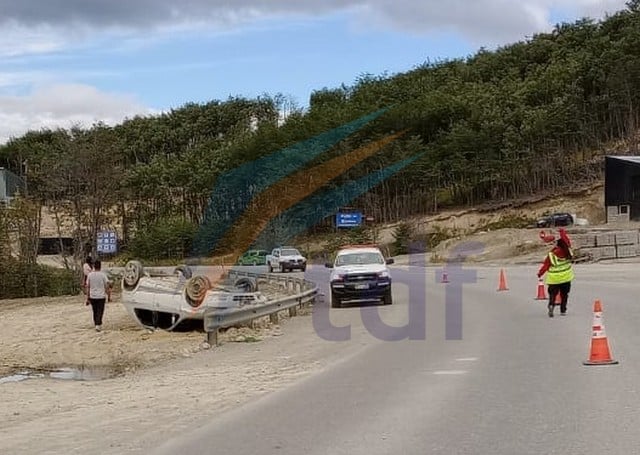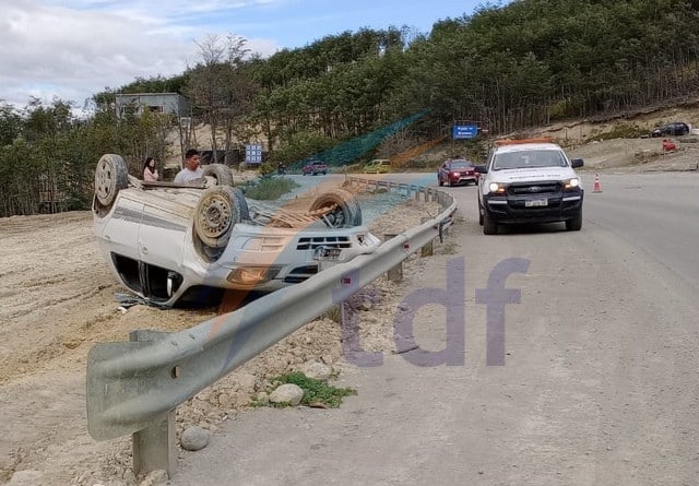 El vuelco del rodado Chevrolet Celta se produjo esta tarde de sábado en la curva del fiscal a la salida de la ciudad de Ushuaia por la ruta nacional 3.