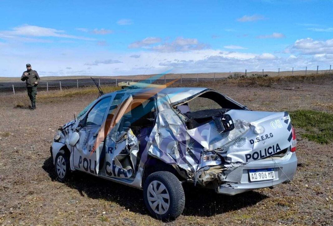 Un violento vuelco protagonizó un patrullero de la División Servicios Especiales de la Policía Provincial a unos 16 kilómetros al sur del Paso fronterizo San Sebastián, durante la jornada de hoy.